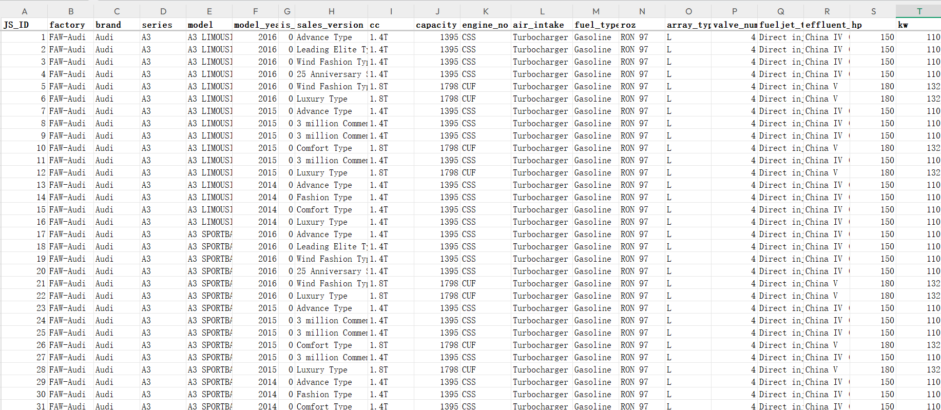 air_intake, fuel_type, roz, array_type, valve_num, fueljet_type, effluent_standard, hp, kw, fuel_consumption_NEDC,