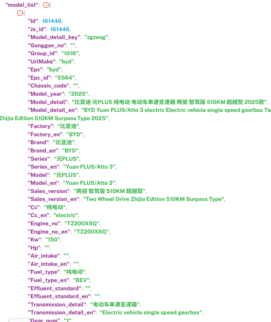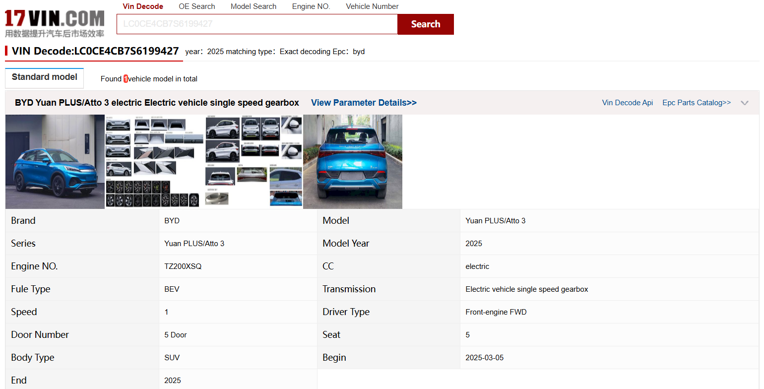17vin.com specializes in vehicle databases for China, providing comprehensive depth data for brands such as BYD, GEELY, CHERY, GREAT WALL, Li, Xpeng, MG, and Changan, including core business dimensions like length, width, height, curb weight, engine model, and new energy battery parameters. With growing Chinese automotive exports to global markets, many local vehicle databases suffer from inadequate adaptation for Chinese brands. Using 17vin's China-specific vehicle database as a reference data source to supplement key parameters can effectively enhance your local database.