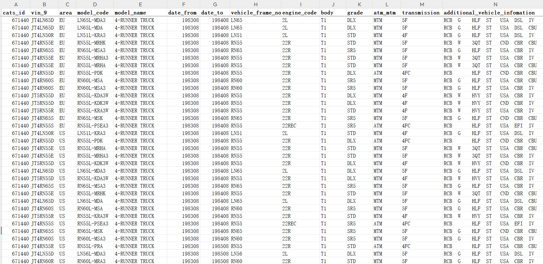 The Toyota offical vehicle database originates from Toyota's integrated EPC system (Electronic Parts Catalog), which serves as the authoritative source containing comprehensive model information across Toyota's entire brand portfolio, including Toyota, Lexus. As the cornerstone of Toyota's global after-sales network, this database enables precise parts identification and technical specification matching through VIN (Vehicle Identification Number) decoding, ensuring 100% compatibility for repair and maintenance procedures.