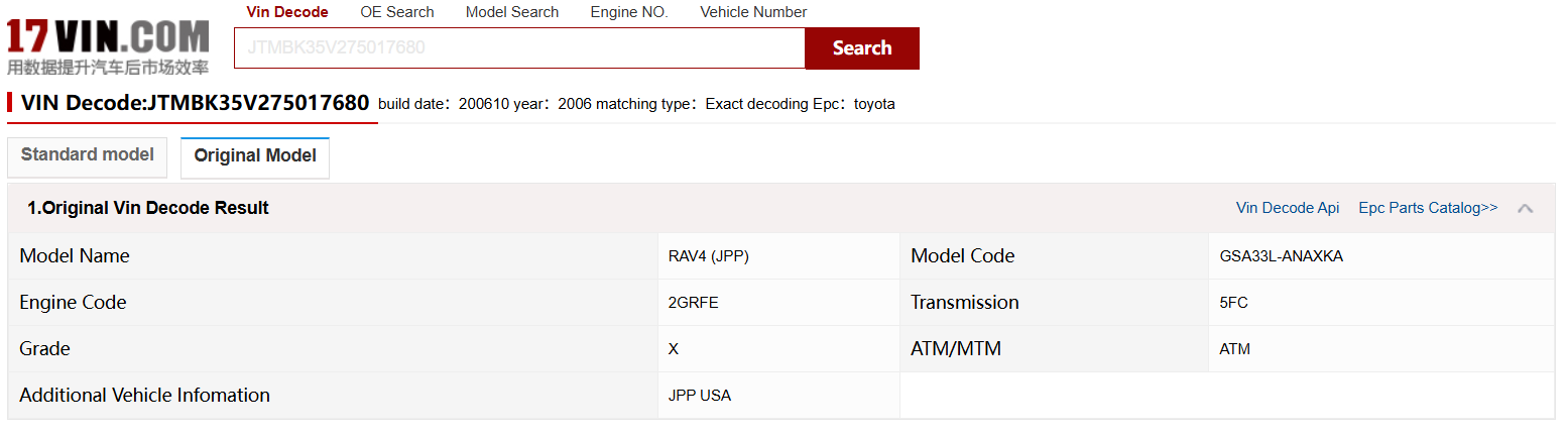 For more accurate VIN decoding results, you can use the VIN lookup feature on 17vin.com.